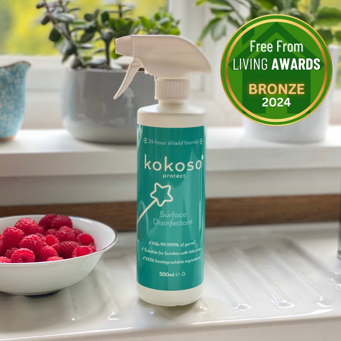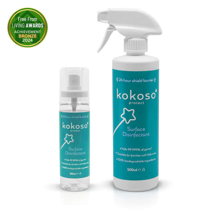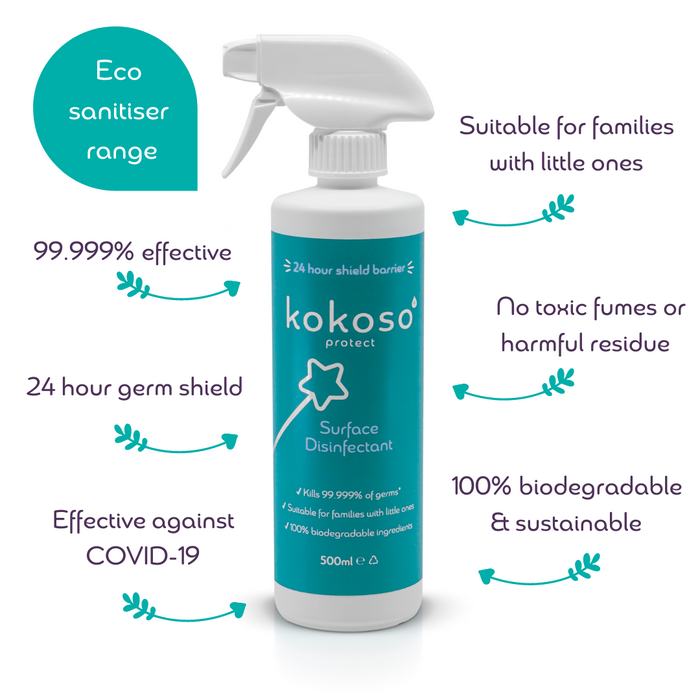 Our child safe Surface Disinfectant Spray, part of the Kokoso Protect sanitiser range, is here to help you protect your home and family from harmful germs with our unique disinfection technology developed through years of science and innovation.